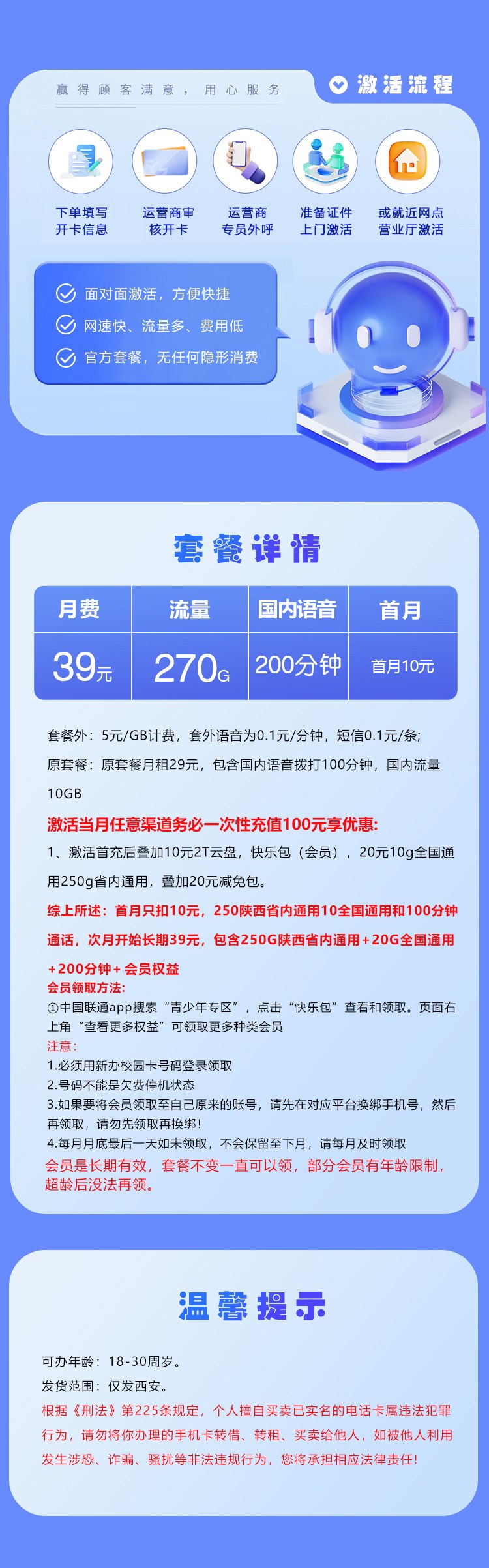 - 月费39元,能拿到270G流量+200分钟国内语音通话