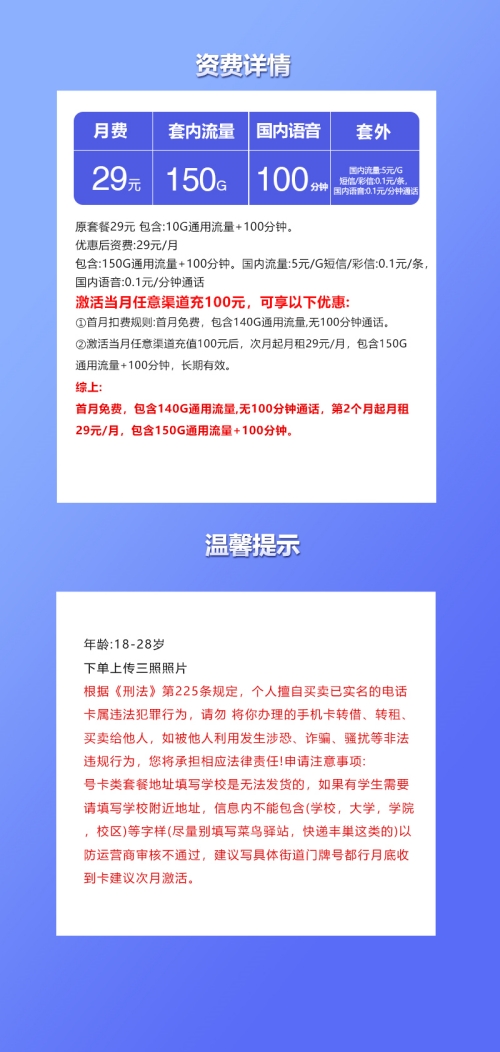 在流量需求暴涨的时代,“既要流量足,又要资费省,最好还能长期稳定” 成了很多人的用卡诉求。今天172号卡推荐的这款套餐,不仅把 “29元月租+150G通用流量+100分钟语音” 的性价比拉满,还自带 “首月免费” 的福利,...