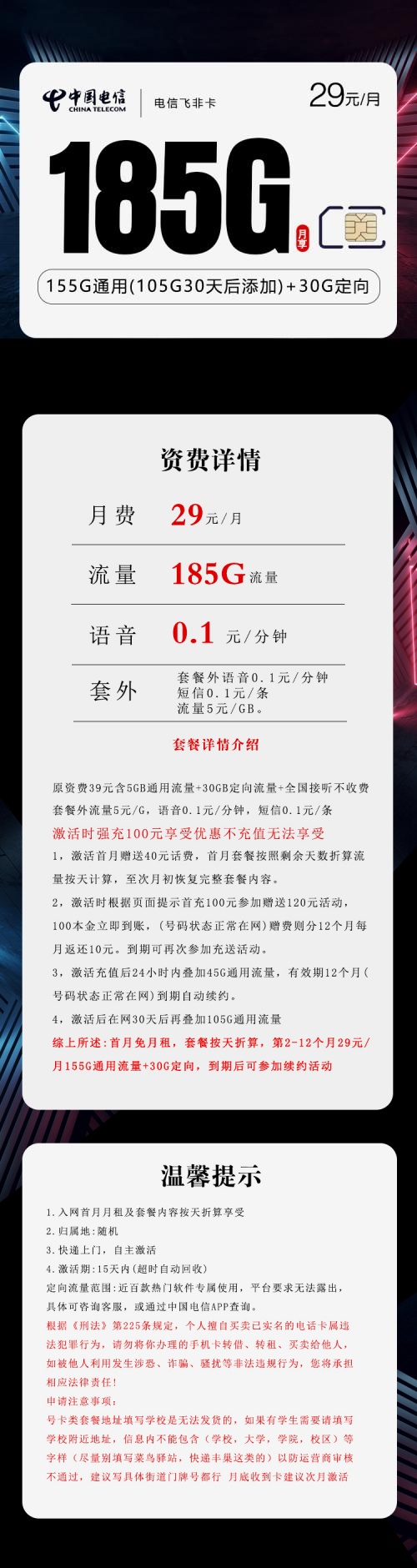 是不是总被流量焦虑支配?刷俩短视频、追半集剧就见 “红条预警”,月租还动辄五六十?最近172号卡挖到个 “流量自由神器”—— 中国电信飞非卡,29元就能拿下185G大流量,这羊毛不薅真亏! 先看套餐 “硬配置”:花小钱...
