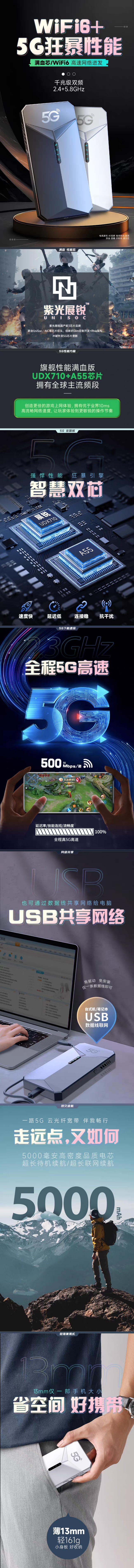 这款5G双网MiFi搭载紫光展锐UDX710+A55双芯片方案,作为国产前3的芯片品牌,展锐UDX710支持全球主流5G频段,搭配A55芯片实现 “高并发双频同时在线”,不仅让5G速率稳定在500Mbps左右,还能把延迟控制在10ms内 —— 不管是《王者荣耀》技能连招,还是4K户外直播推流,都能做到 “零卡顿、无掉帧”。